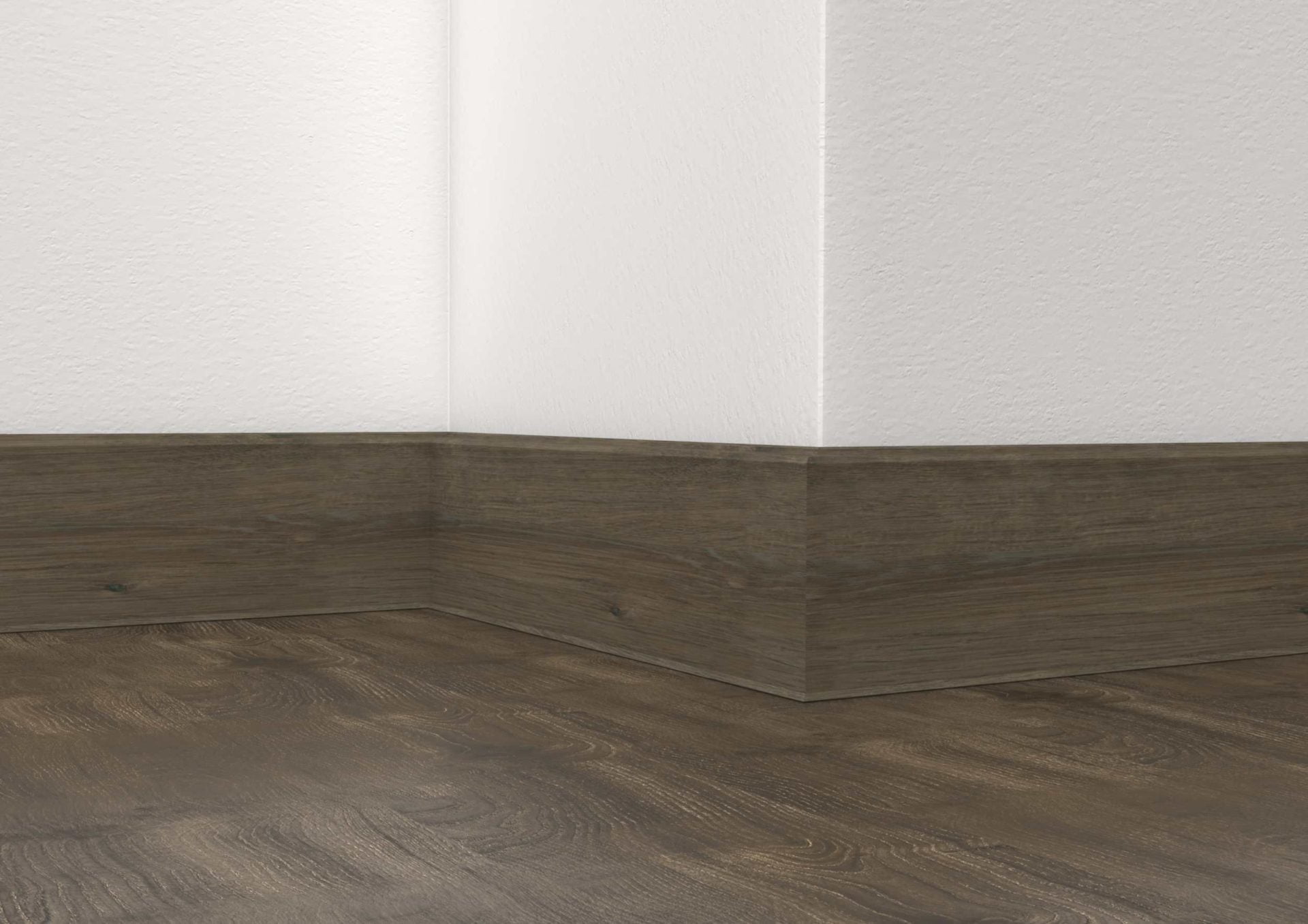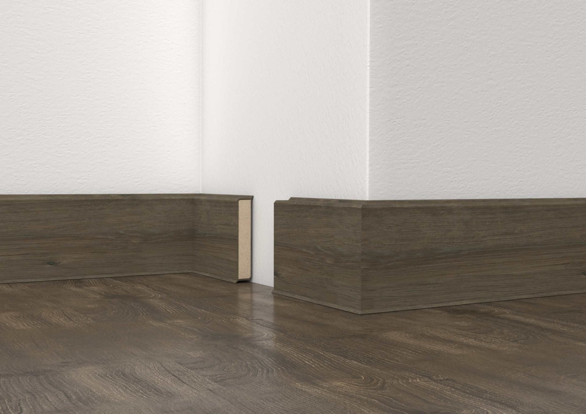 Wyjątkowo wytrzymała listwa Döllken Cubu Decor z rdzeniem HDF otoczonym bezchlorowym polimerem PP/TPE, z elastycznymi krawędziami w górnej i dolnej części.